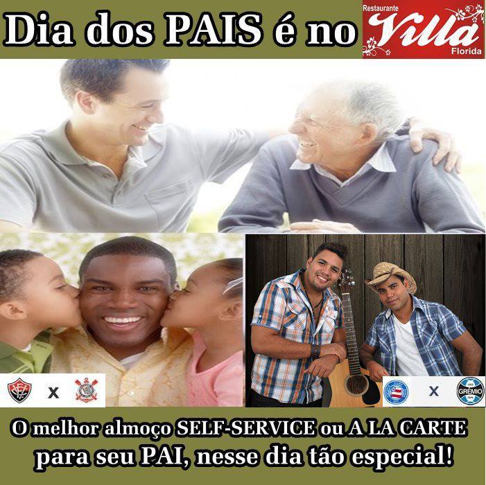 Hoje, é o dia daquele que esteve ao seu lado desde seu nascimento:seu PAI! Por isso, o Restaurante VILLA FLORIDA preparou um cardápio super especial tanto em seu self-service quanto no serviço A La Carte, com excelentes pratos da gastronomia regional e internacional.